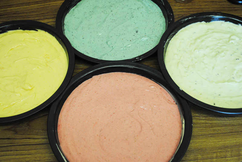 Grease and line 4 6inch tins and split your cake mixture in to 4 bowls.